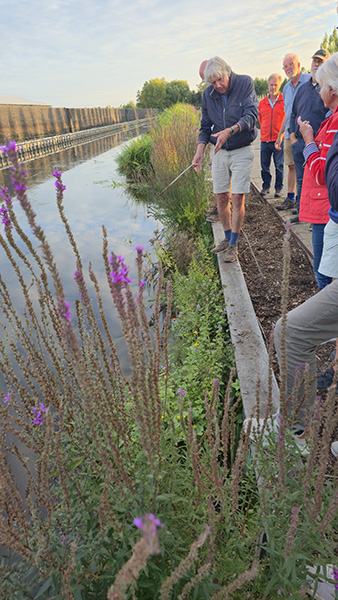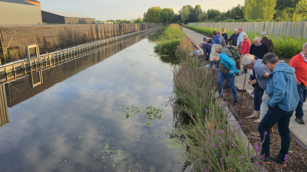 De deelnemers bezochten op maandagavond de kwekerij Vurens in Boskoop. Hier werd getoond hoe de transformatie naar een natuurvriendelijke oever laagdrempelig gerealiseerd kan worden. John van Gemeren van Watersnip Advies vertelde enthousiast over deze nieuwe methode met de naamgeving ‘Kraggen en tillen‘ die door hem is gepatenteerd. De uitvoering van deze methode blijft niet beperkt tot de Watersnip. Ook het Hoogheemraadschap van Rijnland is positief over deze nieuwe opzet.
